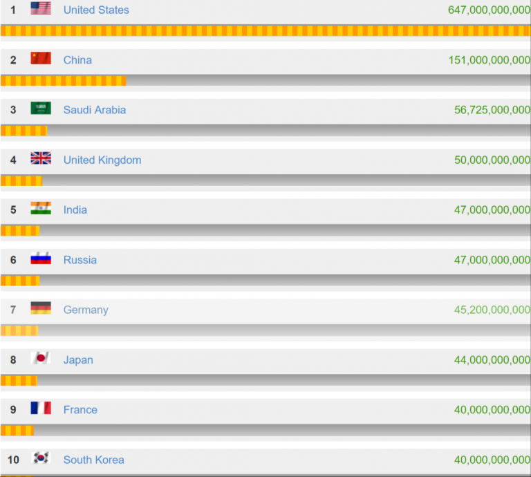 When it comes to defense spending budget, the U.S. takes the leading place with the amount of $647,000,000,000, in 2018. The U.S. spends more on national defense that the next 15 countries combined.