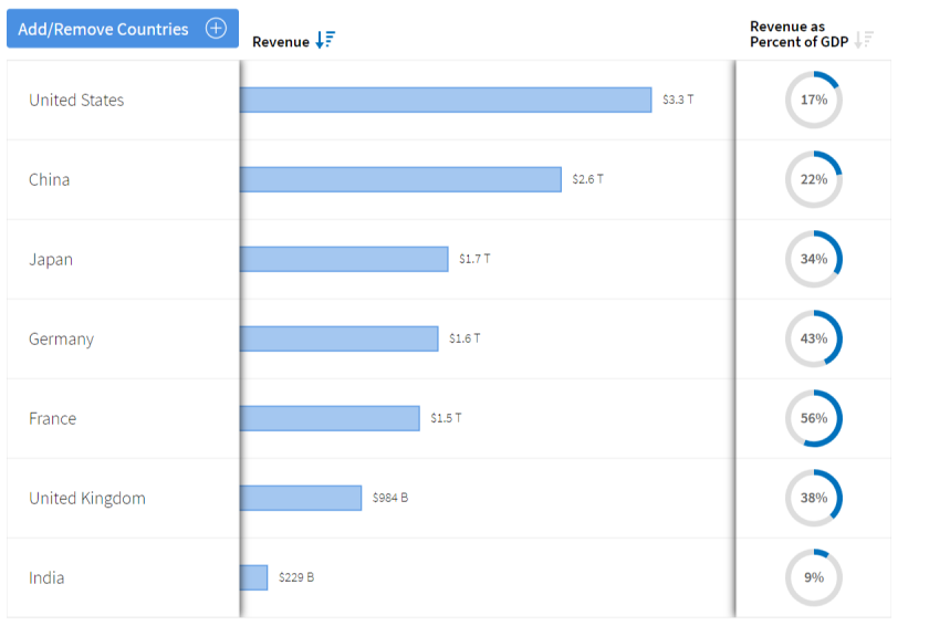 In fact, to have a steady GDP, the government has to ensure that appropriate policies and measures are in place to boost the economy. GDP values vary depending on the countries. Thus, the U.S. government collected $3,3 trillion, which equivalent 17 percent of GDP. In its turn, China accumulated $2.6 trillion, which are equal to 22 percent of GDP.