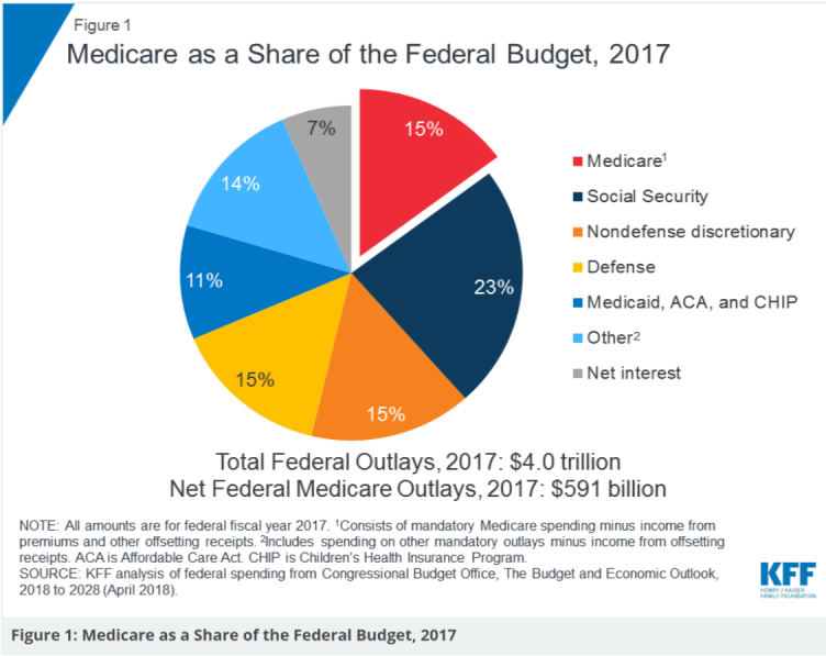 Medicare spending was 15 percent of total federal spending ($1,1 trillion) in 2017 and is projected to rise to 18 percent by 2028
