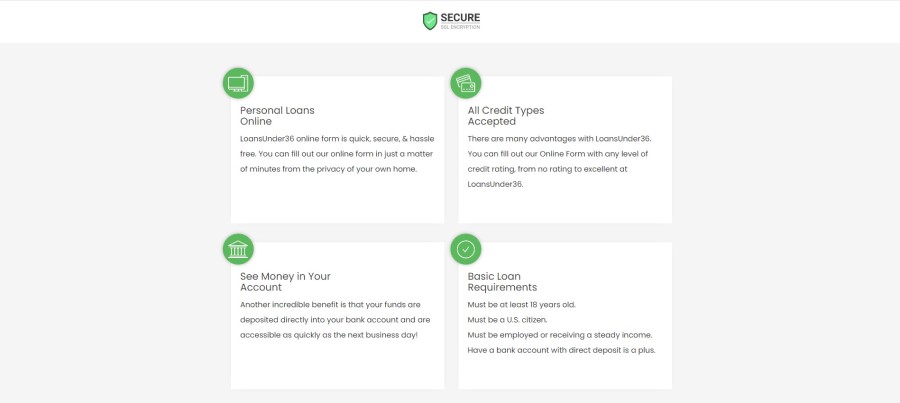 Here are reviews: “I requested a quick emergency credit with this website and got approved, thanks LoansUnder36!”, “If you need emergency funding, you can deposit your cash to your account the next business day. I like it”.