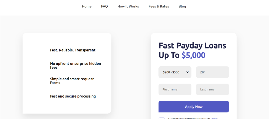 To get a loan a person has to fill in a small form specifying some private information. The company takes care of the clients’ security, so you shouldn’t worry about data leakage. It allows payday loans up to $5, 000.